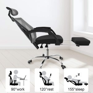 You need an office chair with footrest that can recline fully, all the way to 150 degrees or more. The back should also be adjustable to at least two other angles such as 88 and 120 degrees.